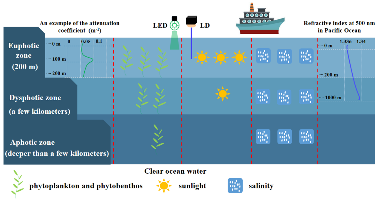 文章首先介紹了水的光學特性,包括不同水質(zhì)的衰減系數(shù)、海洋環(huán)境根據(jù)垂直深度變化導致的水下光學特性的變化等。海洋中垂直分層環(huán)境的概要示意圖如圖1所示。