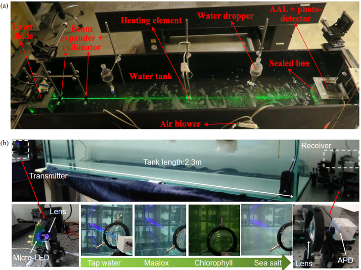 圖3. 在具有(a)不同的氣泡,溫度和鹽度環(huán)境以及(b)不同水質(zhì)下的實際UWOC系統(tǒng)配置。(圖(a)引用自文獻“M.V. Jamali, A. Mirani, A. Parsay, B. Abolhassani, P. Nabavi, A. Chizari, P. Khorramshahi, S. Abdollahramezani, J.A. Salehi, Statistical studies of fading in underwater wireless optical channels in the presence of air bubble, temperature, and salinity random variations, IEEE Transactions on Communications 66 (2018) 4706-4723.” 圖(b)引用自文獻“P.F. Tian, H.L. Chen, P.Y. Wang, X.Y. Liu, X.W. Chen, G.F. Zhou, S.L. Zhang, J. Lu, P.J. Qiu, Z.Y. Qian, X.L. Zhou, Z.L. Fang, L.R. Zheng, R. Liu, X.G. Cui, Absorption and scattering effects of Maalox, chlorophyll, and sea salt on a micro-LED-based underwater wireless optical communication [Invited], Chinese Optics Letters 17 (2019) 100010.”)