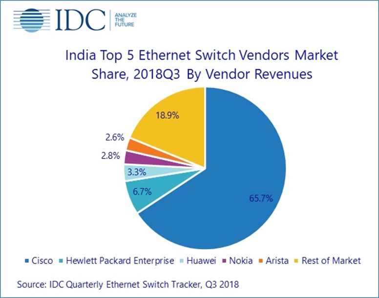 ICCSZ訊(編譯:Vicki)根據(jù)IDC最新的數(shù)據(jù)顯示,印度Q318以太網(wǎng)交換機(jī)市場(chǎng)收入為1.6億美元(按廠商收入計(jì)算),同比增長(zhǎng)34.4%。 ADC和 Layer 3 類別是推動(dòng)整體增長(zhǎng)的主要因素,同比增長(zhǎng)高達(dá)兩位數(shù),而Layer 2也實(shí)現(xiàn)了同比增長(zhǎng),但增長(zhǎng)幅度較小。 政府通過升級(jí)公共基礎(chǔ)設(shè)施和多個(gè)智能城市計(jì)劃推動(dòng)數(shù)字化; 電信基礎(chǔ)設(shè)施現(xiàn)代化推動(dòng)和銀行業(yè)對(duì)網(wǎng)絡(luò)基礎(chǔ)設(shè)施的持續(xù)投資以改善客戶體驗(yàn),預(yù)計(jì)將在未來幾個(gè)季度繼續(xù)推動(dòng)增長(zhǎng)。思科繼續(xù)在以太網(wǎng)交換機(jī)市場(chǎng)占據(jù)主導(dǎo)地位,2018年第三季度的市場(chǎng)份額為65.7%,其次是HPE和華為。