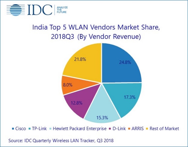 印度的WLAN市場(chǎng)在2018年第三季度達(dá)到了5400萬美元(按供應(yīng)商收入計(jì)算),同比增長(zhǎng)12.0%。 企業(yè)和服務(wù)提供商細(xì)分市場(chǎng)繼續(xù)推動(dòng)增長(zhǎng),但消費(fèi)者細(xì)分市場(chǎng)同比下滑。 企業(yè)對(duì)移動(dòng)友好型網(wǎng)絡(luò)的投資以及政府對(duì)改善大眾無線基礎(chǔ)設(shè)施以及智能城市項(xiàng)目的投資,是印度WLAN市場(chǎng)增長(zhǎng)的關(guān)鍵驅(qū)動(dòng)因素。思科在2018年第三季度的WLAN市場(chǎng)中保持領(lǐng)先地位,其市場(chǎng)份額為24.8%,其次是TP-Link和HPE。