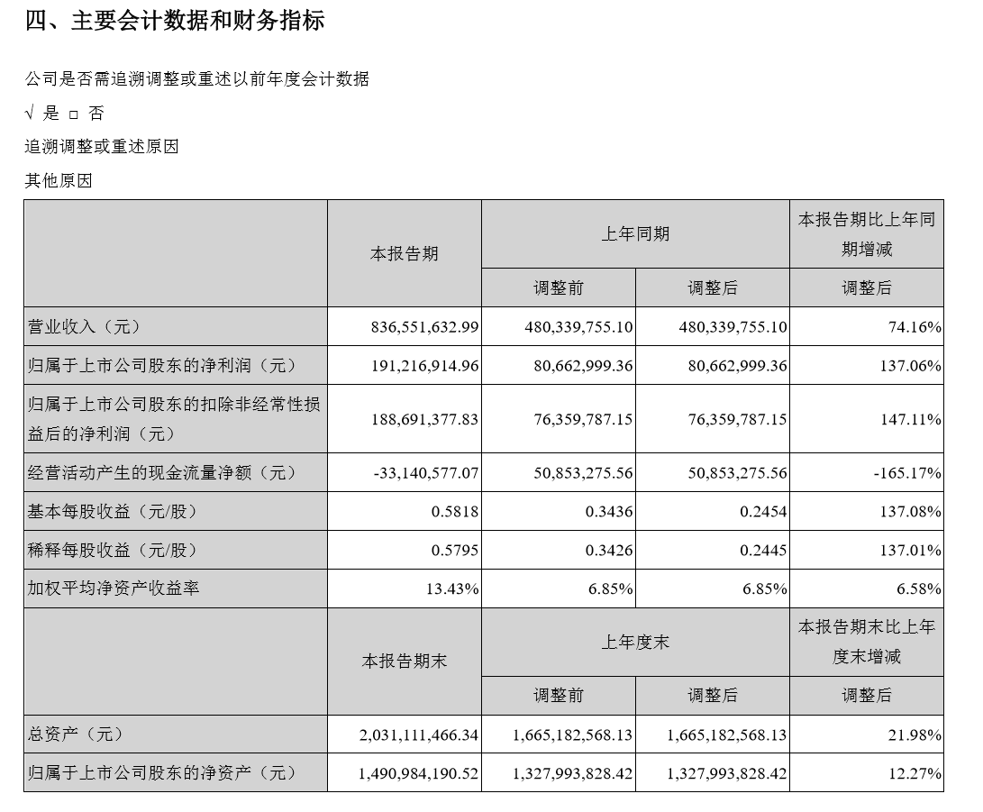 ICC訊 7月31日,成都新易盛通信技術(shù)股份有限公司發(fā)布2020 年半年度報(bào)告。報(bào)告期內(nèi),公司實(shí)現(xiàn)營(yíng)業(yè)收入836,551,632.99元,歸屬于母公司股東的凈利潤(rùn)191,216,914.96元,較上年同期分別增長(zhǎng)74.16%和137.06%。