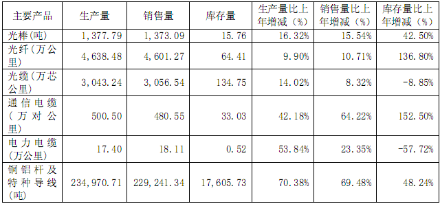 報告期內(nèi),亨通光電的光棒生產(chǎn)1377.79萬噸,同比增長16.32%,銷售1373.09萬噸,同比增長15.54%。光纖生產(chǎn)4638.48萬噸,同比增長9.90%,銷售4601.27萬噸,同比增長10.71%。其他產(chǎn)品詳見下表。