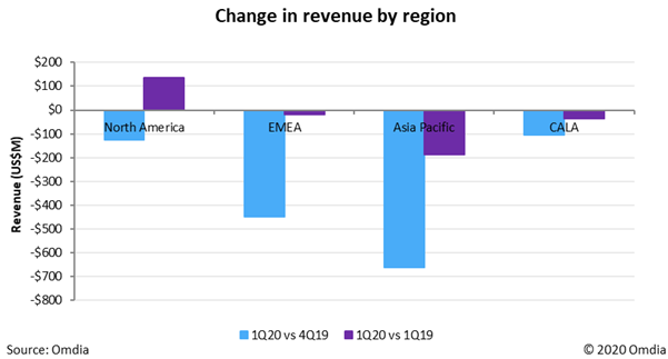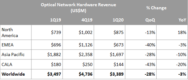 與2019年第一季度相比,2020年第一季度全球網(wǎng)絡(luò)硬件收入僅下降3%。北美是2020年第一季度唯一實現(xiàn)同比增長的地區(qū),這主要是受ICP和5G基礎(chǔ)設(shè)施驅(qū)動。而歐洲、中東和非洲地區(qū)(EMEA)以及北美地區(qū)(NA)可能會在2020年二季度受到更大影響,因為許多企業(yè)在4月和5月停工。