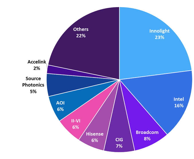 注:Broadcom包含之前Avago Technologies的光模塊業(yè)務(wù) ,劍橋科技包含朗美通的數(shù)通業(yè)務(wù),II-VI包含了Finisar的數(shù)通業(yè)務(wù)。占比較高的“其他”類別中可能包含位居前十的企業(yè):華工正源、易飛揚 、飛速。