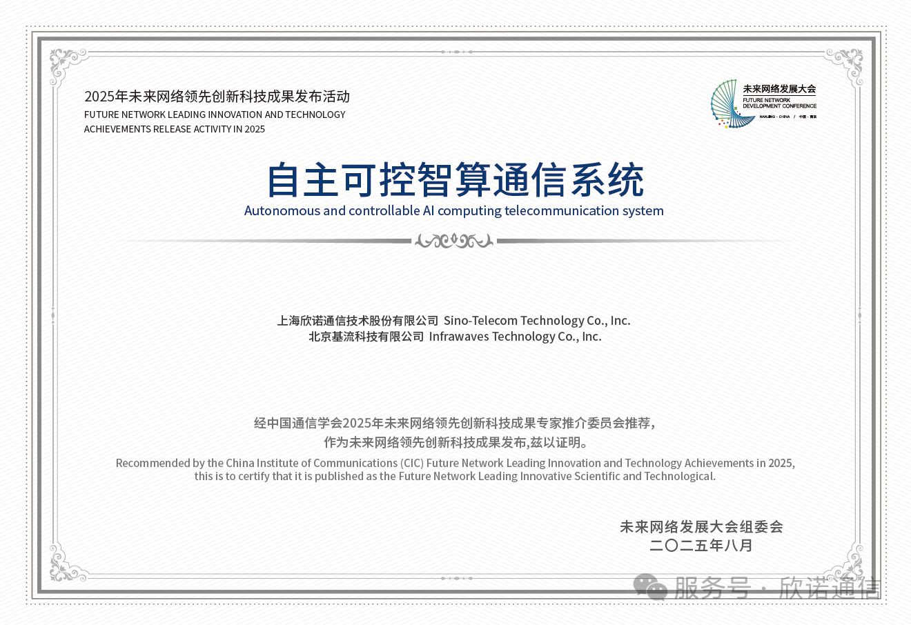 2025年8月21日,在南京上秦淮國際文化交流中心舉辦的第九屆未來網絡發(fā)展大會上,欣諾通信與基流科技聯(lián)合推出的“自主可控智算通信系統(tǒng)”榮獲“未來網絡領先科技創(chuàng)新成果獎”。該獎項充分肯定了其在國產化智算通信領域的技術創(chuàng)新。