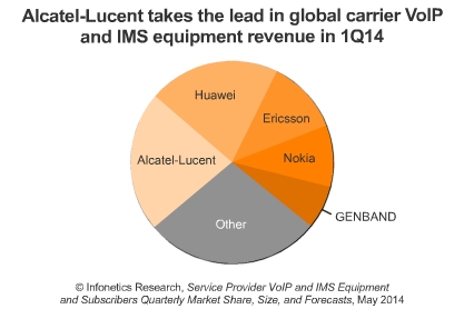 *2014年一季度該市場的領(lǐng)導(dǎo)廠商為阿朗,阿朗主要受益于北美地區(qū)核心IMS和語音應(yīng)用服務(wù)器市場的強勁增長。