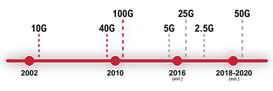 雖然距離50G以太網(wǎng)的IEEE標(biāo)準(zhǔn)落實還有一段時間(大約為2018年至2020年),但多家行業(yè)聯(lián)盟都預(yù)計2016年就會有產(chǎn)品開始出現(xiàn)。與25G技術(shù)類似,50G以太網(wǎng)技術(shù)將成為下一個高速連接服務(wù)器與數(shù)據(jù)中心的解決方案。根據(jù)分析公司Dell’Oro的數(shù)據(jù)顯示,今后幾年,服務(wù)器和高性能閃存存儲系統(tǒng)將會需要超過25G的速度。