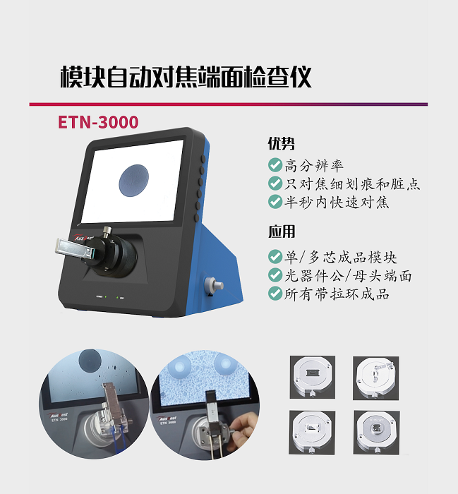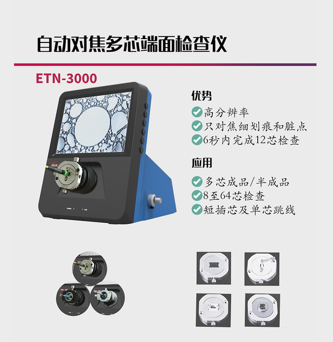 本屆武漢光博會億天龍主要展示臺式自動對焦和自動測試判斷一體化端檢儀,主要包含:單芯,多芯模塊,結(jié)構(gòu)組件,及MTP/MPO,單芯跳線端面檢測儀,同時也將展出光纖端面新材料電動清潔器,以及各型號手持式端檢儀,wifi自動判斷端檢儀。