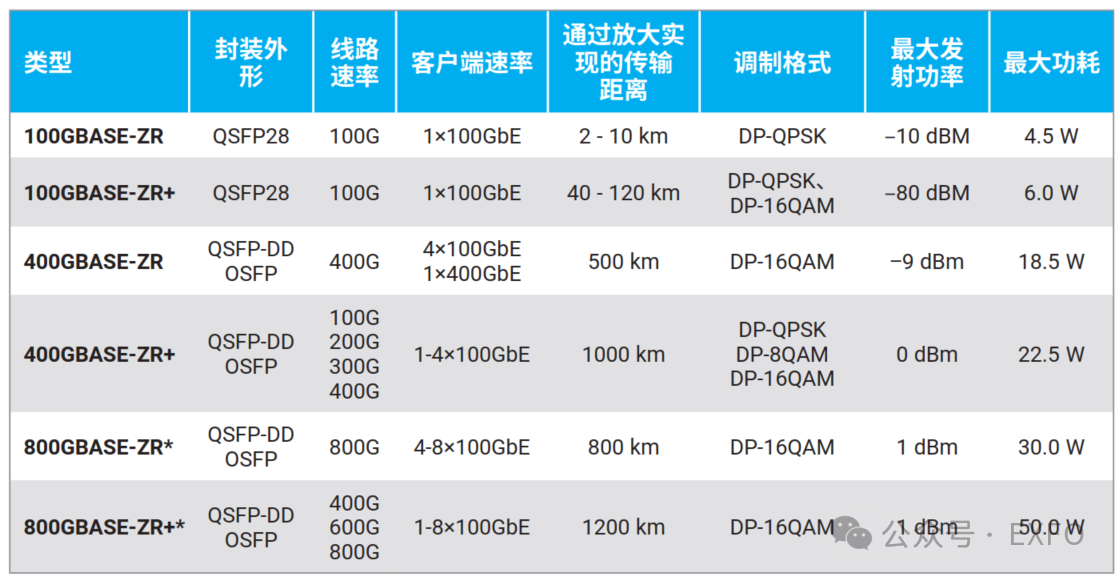 400ZR標(biāo)準(zhǔn)旨在支持高達(dá)80 km的點對點(P2P)高速光傳輸,而無需進(jìn)行光放大,使其成為數(shù)據(jù)中心互聯(lián)(DCI)和城域網(wǎng)的理想選擇。在無放大器的P2P場景中,傳輸距離受信號丟失、色度色散(CD)和偏振模色散(PMD)等因素限制,這些因素可能導(dǎo)致信號在更長距離傳輸中劣化。然而,通過使用光放大器,如摻鉺光纖放大器(EDFA), 400ZR的傳輸距離可增加至80 km以上,具體取決于放大器的質(zhì)量和網(wǎng)絡(luò)配置。盡管如此,對于距離更長的傳輸, PMD仍然是主要的限制因素,需要采用先進(jìn)的數(shù)字信號處理(DSP)技術(shù)來緩解其影響并保持信號完整性。因此,盡管通過使用放大器, 400ZR可實現(xiàn)更長的傳輸距離,但其效率和性能更適合中長距離傳輸。下表列出了ZR的類型及相關(guān)規(guī)格。 800GBASE?ZR光模塊仍處于早期采用階段,其規(guī)格尚未完全標(biāo)準(zhǔn)化。