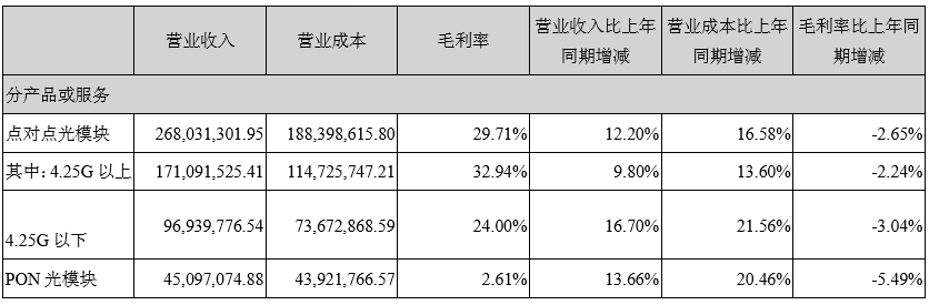新易盛一直專注于光模塊的研發(fā)、制造和銷售,主要產(chǎn)品為點(diǎn)對(duì)點(diǎn)光模塊和PON光模塊,核心技術(shù)均為自主研發(fā)。同時(shí)開發(fā)的產(chǎn)品涵蓋了多種標(biāo)準(zhǔn)的通信網(wǎng)絡(luò)接口、 光波波長(zhǎng)、傳輸速率、傳輸距離等技術(shù)指標(biāo),廣泛應(yīng)用于數(shù)據(jù)寬帶、電信通訊、Fttx、數(shù)據(jù)中心、安防監(jiān)控和智能電網(wǎng)等行業(yè),并能為客戶提供定制化的產(chǎn)品服務(wù)和一攬子解決方案。報(bào)告期內(nèi),新易盛點(diǎn)對(duì)點(diǎn)光模塊產(chǎn)品總營(yíng)收2.68億元,同比增長(zhǎng)12.20%,毛利率29.71%,其中4.25G以上1.71億元,占比63.83%,4.25G以下9694萬(wàn)元,占比36.17%。PON光模塊營(yíng)收4509.7萬(wàn)元,同比增長(zhǎng)13.66%,毛利率2.61%。