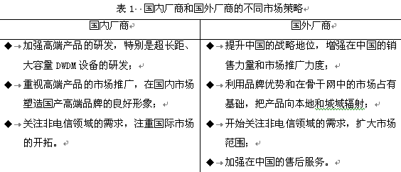 一、光傳輸設(shè)備市場發(fā)展特點(diǎn) 電信行業(yè)的大蕭條對國際電信傳輸市場造成了很大沖擊,從2001年開始,全球光傳輸設(shè)備市場持續(xù)萎縮,連續(xù)三年的增長率均為負(fù)值。相對于國際市場而言,我國傳輸設(shè)備市場的發(fā)展相對平穩(wěn),沒有出現(xiàn)大的起落。 1.國際市場 受電信投資整體下滑的影響,2003年全球光傳輸設(shè)備市場規(guī)模接近63億美元,與2002年相比,下降了16%。但從每季度增長來看,下降幅度在減小,從2003年四季度開始,季度增長有所反彈,增值為15%左右。2004年一季度的季度增長達(dá)到8%左右,在整個(gè)傳輸系統(tǒng)市場仍處于低迷的大環(huán)境下,全球光傳輸設(shè)備市場呈現(xiàn)微弱的復(fù)蘇跡象。 從2003年全球傳輸設(shè)備的細(xì)分市場來看,城域DWDM和MSTP是光傳輸設(shè)備市場的熱點(diǎn),市場份額比2002年均有所上升,而骨干DWDM和SONET/SDHADM設(shè)備市場大幅度下滑,下降幅度超過30%。主要因素是前幾年基礎(chǔ)網(wǎng)絡(luò)過度建設(shè),運(yùn)營商網(wǎng)絡(luò)的擴(kuò)張遠(yuǎn)遠(yuǎn)超過了業(yè)務(wù)的增長。在電信資本市場不回升的情況下,全球各大運(yùn)營公司紛紛把投資重點(diǎn)轉(zhuǎn)向現(xiàn)有傳輸系統(tǒng)的升級上,對網(wǎng)絡(luò)提供多業(yè)務(wù)能力以及系統(tǒng)擴(kuò)容的需求超過了對新建網(wǎng)絡(luò)的需求。 2.國內(nèi)市場 與全球傳輸設(shè)備市場相比,我國的光傳輸設(shè)備市場的發(fā)展較為平穩(wěn)。根據(jù)電信研究院近期出版的《中國電信傳輸市場報(bào)告[i1]》中的數(shù)據(jù),我國光傳輸設(shè)備市場在2001年前后經(jīng)歷了快速增長期,1999年到2001年的年復(fù)合增長率超過50%。隨后幾年的發(fā)展較為平穩(wěn),從2001年到2003年的年復(fù)合增長率降到了9.3%。預(yù)計(jì)今后2~3年我國傳輸設(shè)備市場將以8%左右的速度增長。 前幾年我國電信運(yùn)營商對傳輸網(wǎng)絡(luò)的大量投資造成了網(wǎng)絡(luò)資源的過剩,現(xiàn)有的傳輸骨干網(wǎng)容量基本能夠滿足需求。從2003年開始,電信運(yùn)營商的傳輸系統(tǒng)建設(shè)向城域骨干網(wǎng)和城域接入網(wǎng)滲透,對傳輸網(wǎng)的投資方向也向城域網(wǎng)和傳輸系統(tǒng)擴(kuò)容上偏移。 我國傳輸設(shè)備市場的競爭異常激烈,設(shè)備應(yīng)用呈現(xiàn)本地化趨勢。國外廠商和國內(nèi)廠商在我國傳輸設(shè)備市場的份額呈現(xiàn)此消彼長的趨勢,特別是近兩年,我國主要通信設(shè)備供應(yīng)商加大了高端產(chǎn)品的研發(fā)力度,紛紛進(jìn)軍高端產(chǎn)品市場。預(yù)計(jì)今后2~3年,我國傳輸設(shè)備市場的競爭將更加激烈,國外廠商的市場份額將進(jìn)一步縮減。 二、我國光傳輸設(shè)備市場的“供”與“求” 1.供給市場分析 (1)國內(nèi)廠商迅速崛起 在傳輸設(shè)備領(lǐng)域,國內(nèi)廠商的崛起對國外廠商形成了有力的威脅。目前提供傳輸設(shè)備的國內(nèi)廠商主要有華為、中興通訊、烽火科技;國外廠商主要有朗訊、北電、阿爾卡特、西門子等。國外廠商的市場份額持續(xù)下降,而以華為為首的國內(nèi)廠商已經(jīng)占據(jù)了中國傳輸設(shè)備市場的主導(dǎo)地位,造成這一局面的主要因素如下。 北電等國外廠商主要在我國高端傳輸設(shè)備市場占據(jù)主導(dǎo)地位,中國電信的分拆影響了對骨干傳輸市場的進(jìn)一步投資,從而導(dǎo)致這些廠商市場份額的下滑; 國內(nèi)廠商以低端產(chǎn)品為主要產(chǎn)品,而骨干投資緊縮的形勢并沒有影響省內(nèi)干線網(wǎng)和城域網(wǎng)的建設(shè),因此國內(nèi)廠商抓住時(shí)機(jī),迅速占據(jù)了省干網(wǎng)和城域網(wǎng)市場; 隨著技術(shù)水平的提高和產(chǎn)品的成熟,國內(nèi)廠商也逐漸推出了高端傳輸設(shè)備產(chǎn)品,在高端產(chǎn)品市場上具備了與國外廠商抗衡的能力。 2001年前后,以北電網(wǎng)絡(luò)和朗訊科技為首的國外廠商的市場份額約在70%左右,其中北電網(wǎng)絡(luò)和朗訊科技兩家獨(dú)占42%的市場份額,我國廠商的市場份額約占30%。到2002年,國內(nèi)通信企業(yè)的市場份額已經(jīng)上升到65%,其中華為公司一家的市場份額達(dá)到了40%左右。2003年國外廠商在中國傳輸設(shè)備的市場份額為30%左右。 ?。?)國內(nèi)外廠商發(fā)展策略比較 總體來看,國內(nèi)廠商擁有本土優(yōu)勢,服務(wù)質(zhì)量較國外廠商好,而國外廠商的技術(shù)實(shí)力強(qiáng),在技術(shù)水平和高端產(chǎn)品上具有一定的優(yōu)勢。由于所處的市場境地以及發(fā)展階段的不同,針對競爭日益激烈的國內(nèi)光傳輸設(shè)備,國內(nèi)廠商和國外廠商分別采取了不同的應(yīng)對策略,如表1所示。 ![]() 2.需求市場分析 (1)市場容量 經(jīng)過多年的建設(shè),我國基礎(chǔ)干線傳輸網(wǎng)已經(jīng)基本上能夠滿足現(xiàn)階段的容量需求,運(yùn)營商的主要任務(wù)是對網(wǎng)絡(luò)加以完善,而不是大規(guī)模的網(wǎng)絡(luò)建設(shè)。 2002年中國電信分拆打破了原有的環(huán)路,為恢復(fù)環(huán)路,電信和網(wǎng)通開始了大規(guī)模的補(bǔ)網(wǎng),2002年底完成大部分傳輸設(shè)備的采購,與此同時(shí),中國移動的骨干網(wǎng)建設(shè)也基本完成,因此2003年我國電信運(y