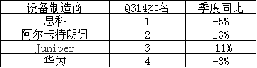 思科、阿爾卡特朗訊、Juniper和華為是服務(wù)供應(yīng)商路由器市場(chǎng)的主要領(lǐng)導(dǎo)者,2014年三季度它們占據(jù)該市場(chǎng)收入超過94%。三季度,思科仍然占有領(lǐng)先地位,阿爾卡特朗訊排名第二位,Juniper和華為分別為第三和第四大供應(yīng)商。