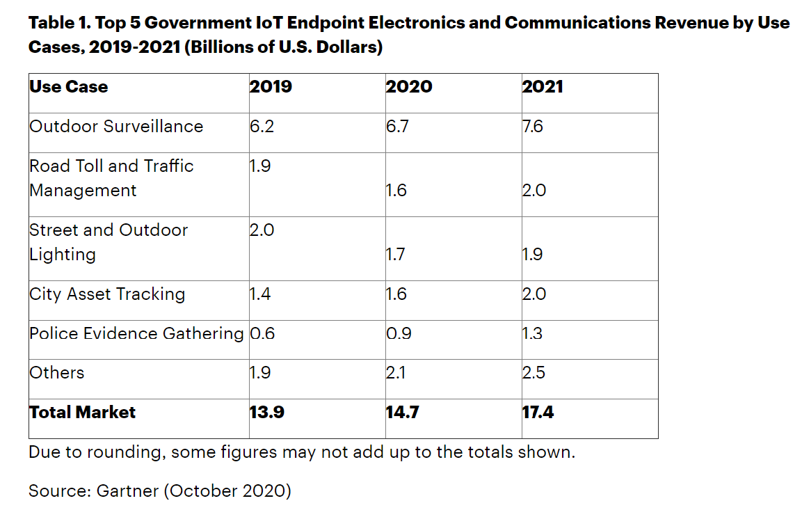 2020年政府物聯(lián)網(wǎng)市場最大的收入機(jī)會是戶外監(jiān)控、街道和戶外照明,以及道路收費(fèi)和交通管理。
