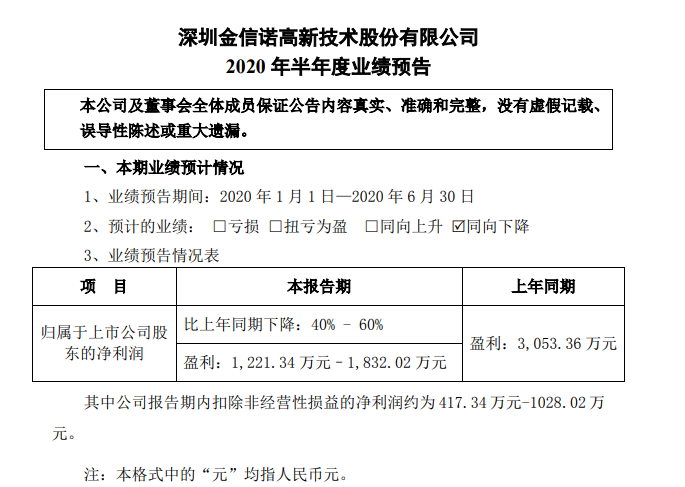 ICC訊 (編輯:Nicole)深圳金信諾高新技術(shù)股份有限公司(以下簡稱:金信諾)發(fā)布2020年半年度業(yè)績預(yù)告:預(yù)計2020上半年業(yè)績同向下降,歸屬于上市公司股東的凈利潤1,221.34萬元–1,832.02萬元,同比下降40% - 60%,上年同期實現(xiàn)盈利3,053.36 萬元。