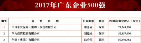 ICCSZ訊  近日,在廣東省省企業(yè)聯(lián)合會和廣東省企業(yè)家協(xié)會發(fā)布《關(guān)于公布2017年廣東企業(yè)500強及行業(yè)100強的通知》文件中,從新一輪榜單區(qū)域分布可見,2017年廣東企業(yè)500強主要集中在珠三角區(qū)域,其中深圳以195家居首位,中國平安保險(集團)股份有限公司、華為投資控股有限公司占據(jù)“廣東500強”前二,中興通訊股份有限公司排名前20名。