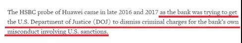 根據(jù)路透社當時的報道,匯豐在2016年年底到2017年開始“配合”美國司法部對華為發(fā)起的“調(diào)查”,原因是為了換取美國司法部對匯豐銀行的寬恕,因為匯豐本身還涉及其他違反美國制裁禁令的案件。