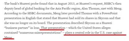 其中,如今被加拿大政府扣押的這位華為公司的高管與匯豐銀行的一位高管當面進行了溝通,表示華為沒有任何不合規(guī)的情況,并給這位匯豐高管提供了一份PPT文件說明情況。