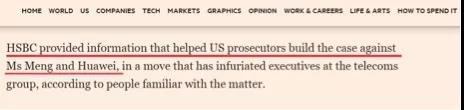 這些路透社報道的事件經(jīng)過,在英國《金融時報》前兩天的最新報道中被再次提及。而且《金融時報》也在報道中寫到了“匯豐給美國司法部起訴華為提供了信息和幫助”這樣的內(nèi)容。