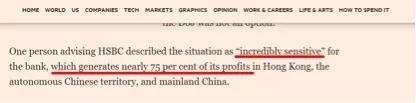 但一位給匯豐提供咨詢服務的人士對《金融時報》表示此事令匯豐正處在一個“極度敏感”的情況下,因為匯豐近75%的收益來自中國大陸和中國香港特區(qū)。