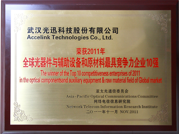 2011年11月23日,中國(guó)光通信發(fā)展與競(jìng)爭(zhēng)力論壇(ODC’2011)在北京召開(kāi),在本次論壇開(kāi)幕式上,2009年中國(guó)光通信最具競(jìng)爭(zhēng)力企業(yè)10強(qiáng)頒獎(jiǎng)儀式隆重舉行,來(lái)自中國(guó)綜合光通信、光纖光纜、光傳輸與