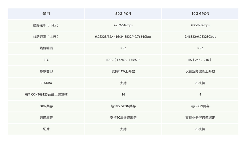 50G-PON和10G GPON技術(shù)的關(guān)鍵功能性能對比如表1所示。