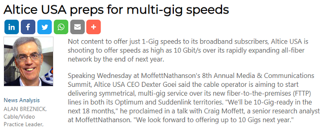 ICC訊(編譯:Nina)據(jù)外媒Light Reading消息,Altice USA不滿足于僅為其寬帶用戶提供1Gig的網(wǎng)速,它計劃在明年年底之前,通過其迅速擴張的全光纖網(wǎng)絡(luò)提供高達10Gbit/s的網(wǎng)速。