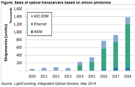 無論如何,硅光子技術(shù)的進(jìn)步是令人鼓舞的。根據(jù)LightCounting在2018年5月發(fā)布的集成光學(xué)器件報(bào)告,基于硅光子組件的光模塊銷售額在2015年和2016年翻了一番,2017年增速放緩到22%。與爆發(fā)式增長(zhǎng)預(yù)期相反,LC分析認(rèn)為,硅光子技術(shù)將逐步獲得市場(chǎng)份額,預(yù)計(jì)2023年銷售額達(dá)到24億美元。