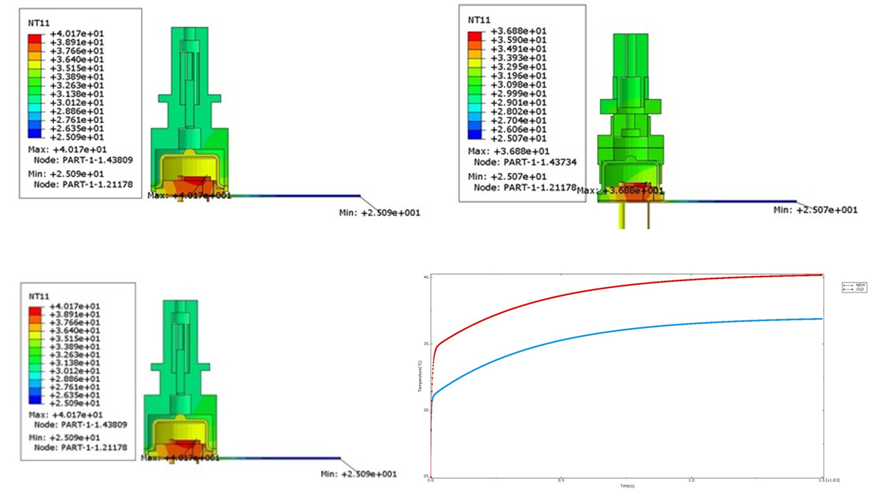 四、熱仿真示例1. 以TOSA為例,通過(guò)不同Receptacle的結(jié)構(gòu)設(shè)計(jì)可以看出溫度隨時(shí)間變化曲線,如下圖所示,通過(guò)熱仿真得知兩種結(jié)構(gòu)溫度差異達(dá)到5℃左右。