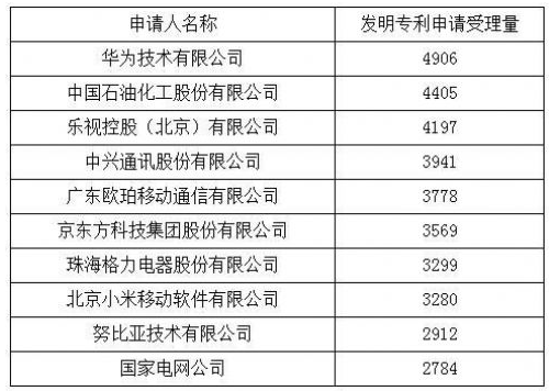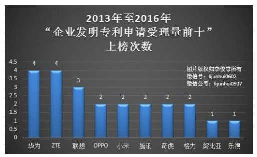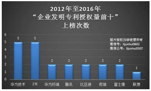 國家知識產(chǎn)權(quán)局從2013年起開始公布“我國發(fā)明專利申請受理量排名前十位”名單,從2012年至2016年,華為、中興均連續(xù)4年上榜。