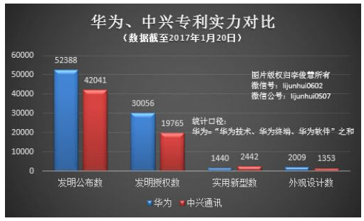 來自國家知識產(chǎn)權(quán)局網(wǎng)站的統(tǒng)計信息顯示,截至2017年1月20日,發(fā)明公布數(shù)方面,華為是52388件,中興是42041件;發(fā)明授權(quán)數(shù)方面,華為是30056件,中興是19765件;實用新型數(shù)方面,華為是1440件,中興是2442件,外觀設(shè)計數(shù)方面,華為是2009件,中興是1353件。