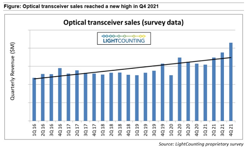 ICC訊(編譯:Nina)LightCounting(LC)最新報(bào)告指出,2021年第四季度,盡管部分企業(yè)受到供應(yīng)問題的嚴(yán)重影響,但光通信行業(yè)繼續(xù)受益于互聯(lián)網(wǎng)服務(wù)及相關(guān)設(shè)備和器件的需求激增,創(chuàng)下了許多記錄。