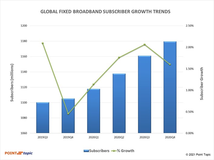 Figure 2. Global broadband subscribers and quarterly growth rates. Source – Point Topic.