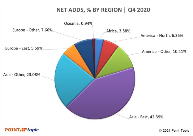 Figure 3. Share of net adds of fixed broadband subscribers by region. Source – Point Topic.
