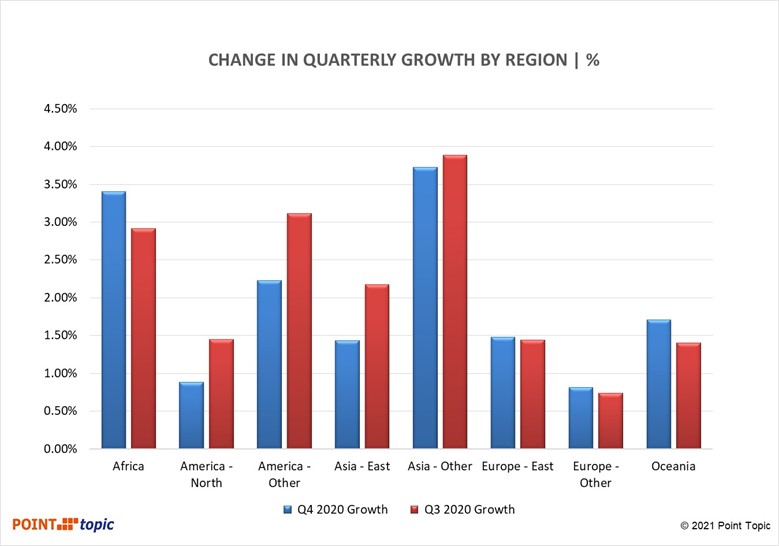 Figure 5. Quarterly growth in fixed broadband subscribers by region, Q4 2020 vs Q3 2020. Source: Point Topic.
