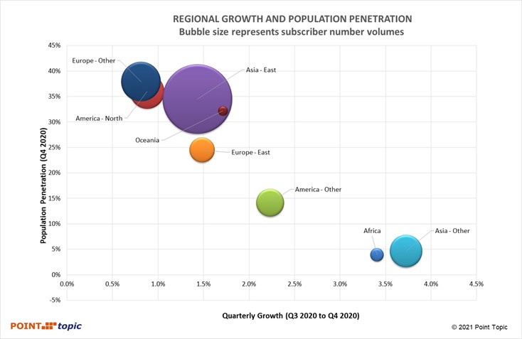 Figure 7. Penetration and quarterly growth by region (size of bubble represents subscriber volume in Q4 2020). Source – Point Topic.