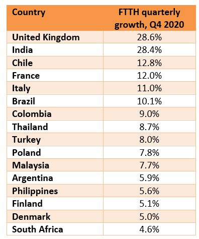 Figure 10. Top markets by FTTH growth rate in Q4 2020 (countries with at least 0.5m fibre broadband subscribers). Source: Point Topic.