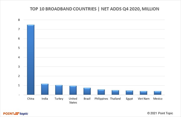 Figure 14. Country ranking by fixed broadband net additions in Q4 2020. Source – Point Topic.