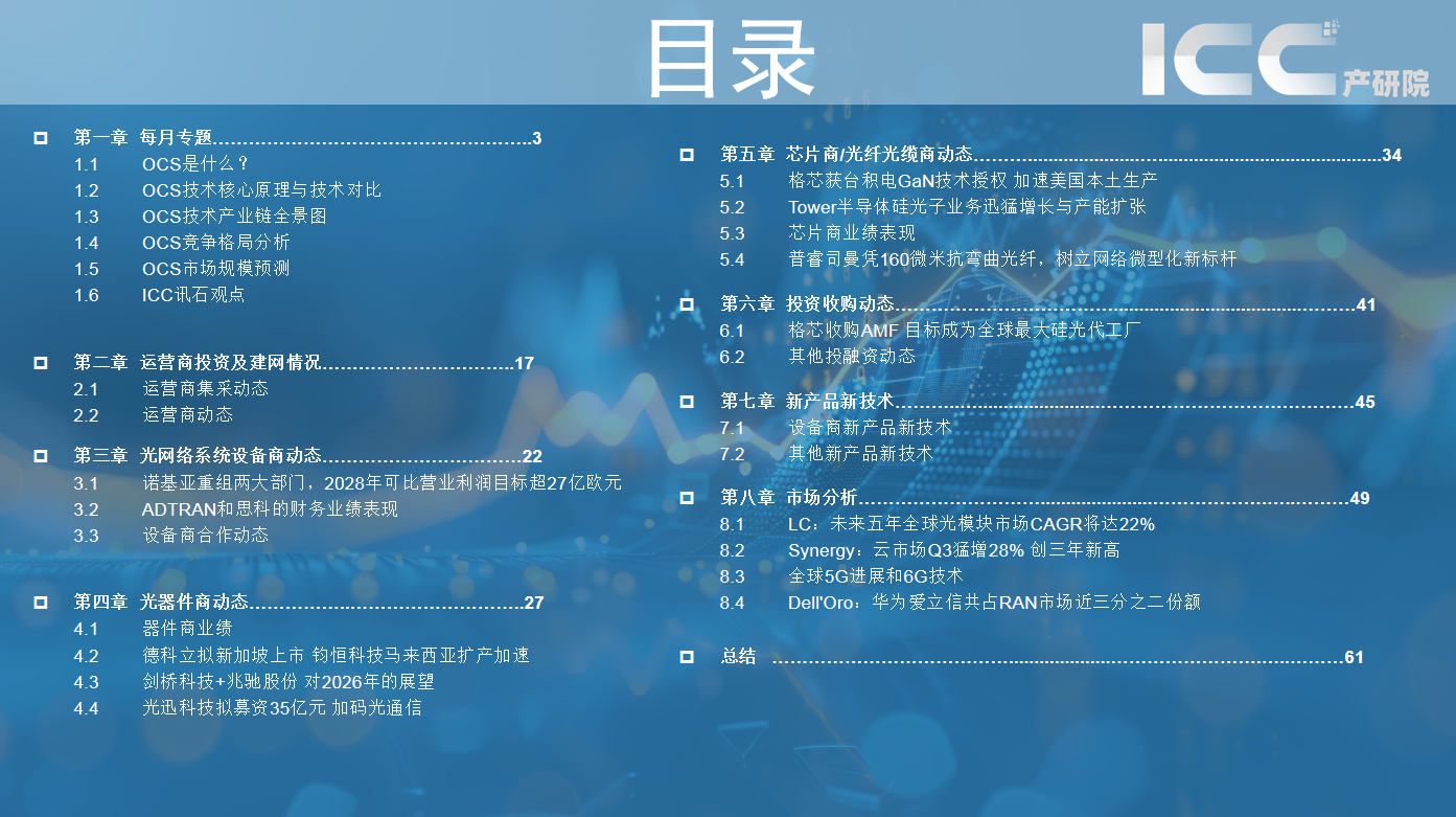 ICC訊 ICC訊石最新發(fā)布的《全球光通訊市場(chǎng)動(dòng)態(tài)月報(bào)(2025年11月刊)》。此次報(bào)告分析了光通信熱點(diǎn)技術(shù)OCS、匯集了運(yùn)營(yíng)商集采投資、設(shè)備與器件商動(dòng)態(tài)、芯片商進(jìn)展、收購?fù)度谫Y、新產(chǎn)品技術(shù)及市場(chǎng)數(shù)據(jù)等多維度熱點(diǎn)動(dòng)態(tài),為行業(yè)參與者提供關(guān)鍵決策參考。月報(bào)已通過郵件發(fā)送至?xí)T郵箱,敬請(qǐng)查收,如有疑問歡迎聯(lián)系:15989420950 馮經(jīng)理。