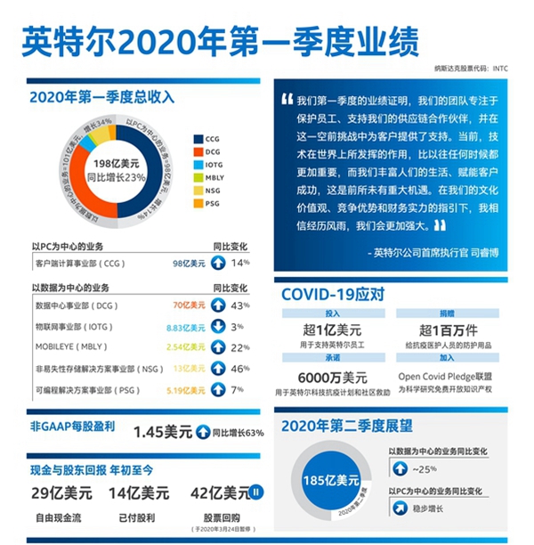 “第一季度業(yè)績證明,我們的團隊專注于保護員工,支持我們的供應(yīng)鏈合作伙伴,并在這一前所未有的挑戰(zhàn)中為我們的客戶提供服務(wù)?!?A href="http://partyval.com/site/CN/Search.aspx?page=1&keywords=%e8%8b%b1%e7%89%b9%e5%b0%94&column_id=ALL&station=%E5%85%A8%E9%83%A8" target="_blank">英特爾首席執(zhí)行官鮑勃-斯萬(Bob Swan)在財報中說道。“技術(shù)在當(dāng)今世界上發(fā)揮的作用現(xiàn)在比以往任何時候都更加重要,我們豐富生活和使客戶獲得成功的機會從未像現(xiàn)在這樣重要過。在我們的文化價值、競爭優(yōu)勢和財務(wù)實力的指引下,我有信心我們將從當(dāng)前形勢下脫穎而出,成為一家更強大的公司。”