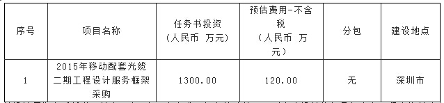 ICCSZ訊 6月24日中國(guó)電信公布深圳電信分公司2015年移動(dòng)配套光纜二期工程設(shè)計(jì)服務(wù)框架采購(gòu)招標(biāo)公告,任務(wù)書投資人民幣1300萬元,具體信息如下: