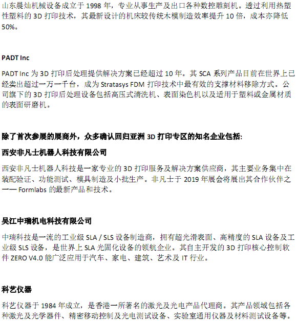 摘要:廣州國際模具展亞洲3D打印專區(qū)強勢回歸匯聚知名3D打印企業(yè)。有賴眾多3D打印展商的鼎力支持,目前亞洲3D打印專區(qū)的面積與去年同期相比增加超過20%,再次成為廣州國際模具展覽會 (Asiamold) 亮點。2019年,亞洲3D打印專區(qū)將匯聚一眾世界領先品牌,展示海內外3D企業(yè)嶄新的增材制造技術和解決方案。