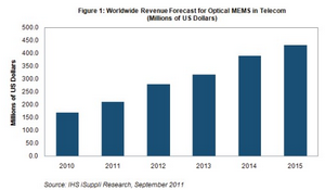 據(jù)IHS公司的最新MEMS市場研究報告,由于市場對寬帶互聯(lián)網(wǎng)服務(wù)的需求持續(xù)激增,預(yù)計2011年以及隨后幾年光MEMS銷售額強(qiáng)勁增長。光MEMS是超高速光纖網(wǎng)絡(luò)中的關(guān)鍵部件。