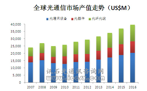 【訊石光通訊咨詢網(wǎng)】近六年來,光纖通信行業(yè)經(jīng)歷了金融海嘯、現(xiàn)階段還在蔓延的歐債危機(jī)等一直以來的宏觀經(jīng)濟(jì)不確定性和日本地震海嘯以及泰國(guó)洪災(zāi)等自然災(zāi)害的挑戰(zhàn)。除了2009年那場(chǎng)蔓延全球的金融海嘯使得光纖通信市場(chǎng)一度萎縮之外,近年來,全球光纖通信市場(chǎng)產(chǎn)值一直保持增長(zhǎng)趨勢(shì)。