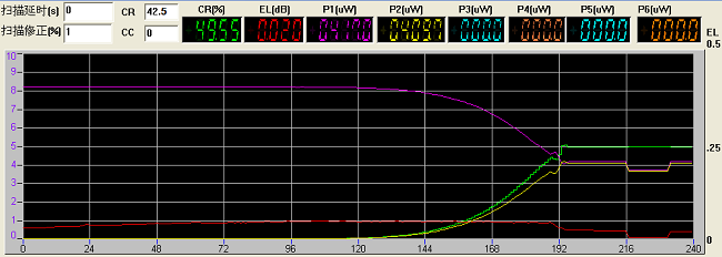 拉錐性能驗證:光纖在熔融拉伸過程中,材料缺陷和波導(dǎo)結(jié)構(gòu)變化等原因,會導(dǎo)致器件的光功率損失。該驗證就是根據(jù)器件光功率損耗的大小和器件的穩(wěn)定性直接評估該光纖是否適合制作熔融拉錐型光纖器件。下圖是PH1010-C光纖進(jìn)行拉錐得到的功率/損耗曲線,記錄了光纖從開始拉伸直至光纖拉錐機(jī)停機(jī)整個過程中功率/損耗隨拉伸長度的變化(P1是光纖輸出功率,EL是附加損耗,CR是分光比)。驗證采用1310/1550nm單模泵浦光源,拉錐期間PH1010-C光纖的損耗波動很平緩,損耗始終低于0.1dB。