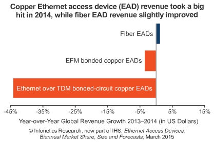 以太網(wǎng)接入設(shè)備商的開(kāi)支達(dá)到9.25億美元,相比2013年下滑了3.5%,這主要是由于基于TDM的以太網(wǎng)設(shè)備板塊的持續(xù)下滑。