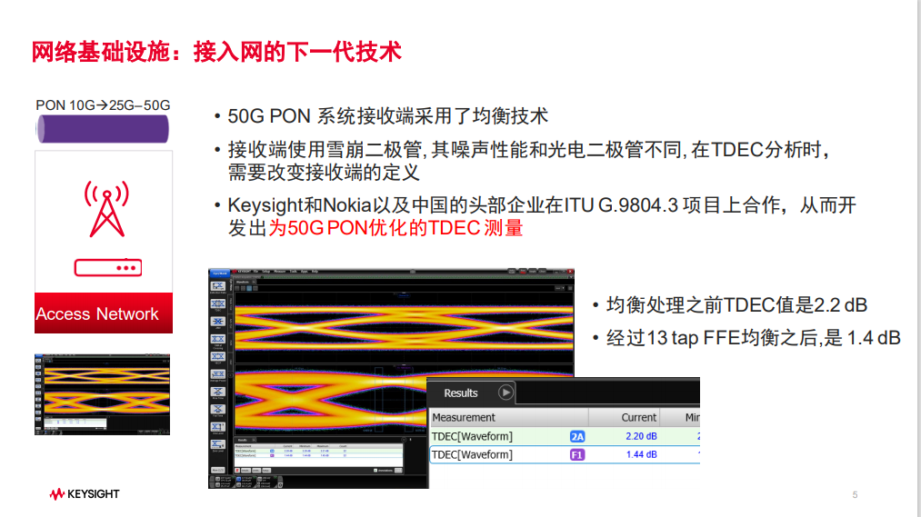 根據(jù)工信部的最新數(shù)據(jù),截至2022年10月底,全國共有110個(gè)城市達(dá)到千兆城市建設(shè)標(biāo)準(zhǔn),千兆城市平均城市家庭千兆光纖網(wǎng)絡(luò)覆蓋率超過100%,實(shí)現(xiàn)城市家庭千兆光網(wǎng)全覆蓋。隨著各省市對(duì)“千兆光網(wǎng)”政策的大力推進(jìn),10G PON技術(shù)正逐漸完成接入網(wǎng)升級(jí)。而下一代接入網(wǎng)技術(shù)開發(fā)正在路上,今年9月,IEEE和ITU-T已經(jīng)完成了25G和50G PON的標(biāo)準(zhǔn)制定。是德科技預(yù)計(jì)2023年底將會(huì)有25G、50G商業(yè)化產(chǎn)品發(fā)布,2024/2025開始商業(yè)化部署,中國則領(lǐng)先其他地區(qū)2-3年時(shí)間,直接從10G PON跨越到50G PON的部署。針對(duì)25G、50G PON的預(yù)研,是德科技推出了相應(yīng)的測(cè)試技術(shù),測(cè)試軟件和硬件,加快市場(chǎng)應(yīng)用。公司和中國以及其他國家的頭部企業(yè)在ITU G.9804.3 項(xiàng)目上緊密合作,開發(fā)出為50G PON優(yōu)化的TDEC 測(cè)量。