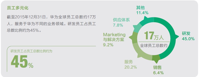 ICCSZ訊 在充滿機遇的信息社會里,社會的變革和發(fā)展也越來越多強調(diào)人的創(chuàng)造力。截至2015年底,華為全球員工總數(shù)約17萬人,其中研發(fā)人員占比45%,華為周四發(fā)布的《2015年可持續(xù)發(fā)展報告》顯示。