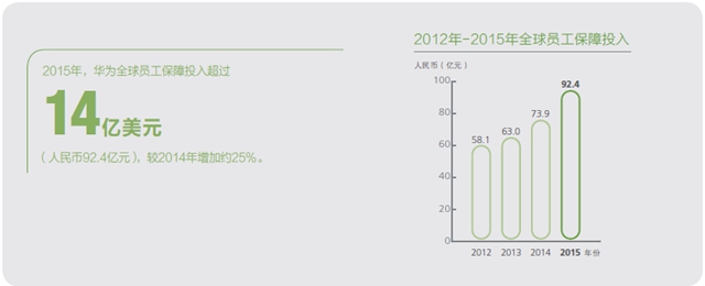 除了采用有競爭力的薪酬制度、推行全球員工TUP長期激勵計劃,這家公司還建立了完善的員工保障體系,由社會保障、商業(yè)保險及醫(yī)療救助三個部分組成,為全球員工構(gòu)筑起全覆蓋的“安全傘”。2015年,其全球員工保障投入超過14億美元(92.4億人民幣),同比增長約25%。