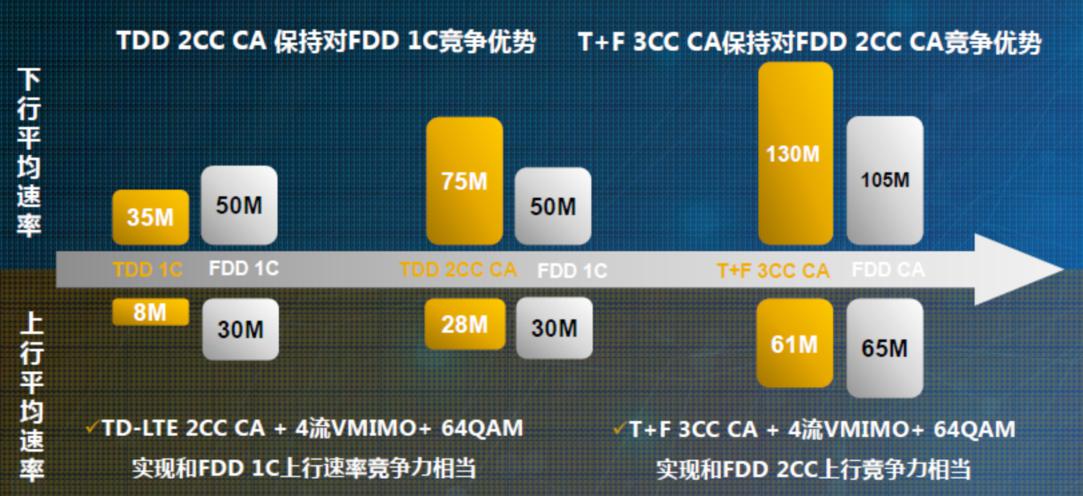 TDD/FDD融合組網(wǎng)對于中國移動(dòng)有著多重的重要性:其一,只有TDD/FDD融合組網(wǎng)后結(jié)合載波聚合功能實(shí)現(xiàn)130M下行/60M上行才能確保在速率上時(shí)時(shí)都能領(lǐng)先FDD一步(如圖所示);其二,只有TDD/FDD融合組網(wǎng)才能幫助中國移動(dòng)擺脫其國際合作伙伴的FDD LTE用戶漫游到中國移動(dòng)網(wǎng)絡(luò)上無4G可用的尷尬境地;其三,隨著移動(dòng)寬帶步入物聯(lián)網(wǎng)時(shí)代,當(dāng)寬帶由人的連接發(fā)展到“人+物”的連接,TDD(時(shí)分雙工)技術(shù)適應(yīng)非對稱業(yè)務(wù)的優(yōu)勢會(huì)由于上行受限而變成劣勢,所以TDD/FDD融合組網(wǎng)是必然趨勢。