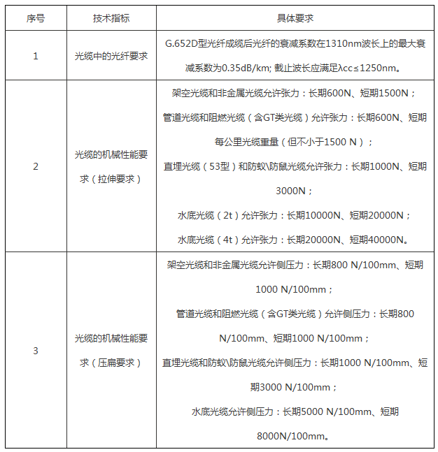 (二)2018年中國電信具體室外光纜和中心管式非金屬扁平光纜的技術(shù)指標(biāo)要求如下: